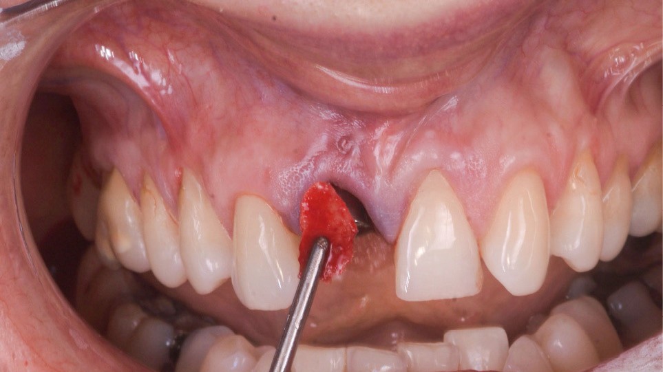 Lorsque le déficit osseux vestibulaire est modéré, la technique IDR décrite par Da Rosa [1] peut être envisagée. Elle repose sur un prélèvement osseux tubérositaire sous forme de bloc cortical, ajusté et stabilisé au niveau du défaut (fig. 2), complété par de l’os particulaire tubérositaire, sans recours à un biomatériau. Un greffon conjonctif est positionné en vestibulaire, et la mise en place d’une prothèse provisoire en sous-occlusion est indispensable pour stabiliser le volume reconstruit.
