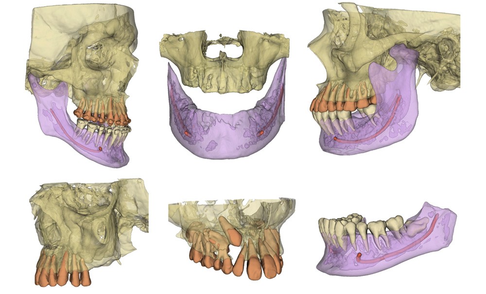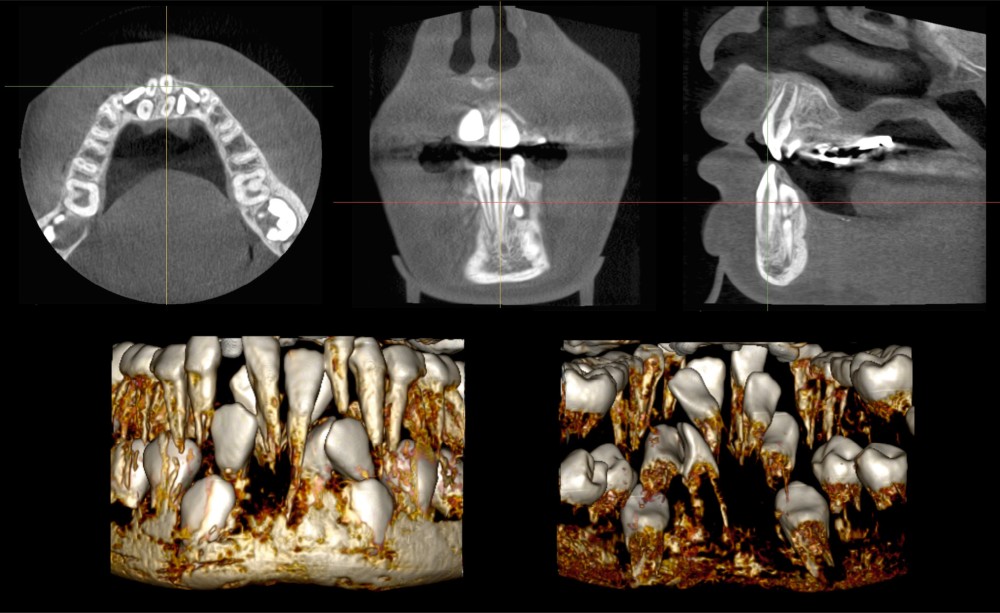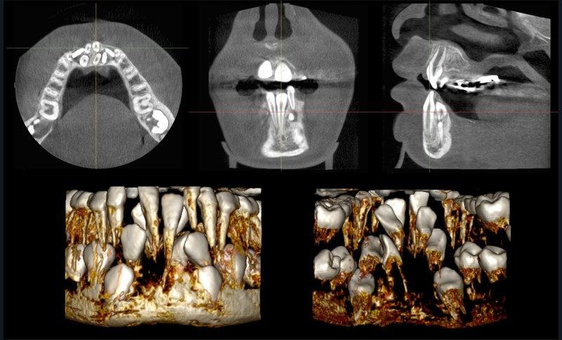 L’analyse de l’imagerie CBCT est rendue difficile par le nombre important de dents surnuméraires présentes dans le secteur incisivo-canin mandibulaire. En particulier, la reconstruction volumique ne permet pas d’appréhender finement la position des différentes dents et de leurs racines. Cela complique l’établissement du plan de traitement, devant établir quelles sont les dents à avulser et celles à tracter avec un appareillage orthodontique. Cette décision de traitement serait grandement facilitée par des informations tridimensionnelles supplémentaires sur la forme des différentes dents, leur position tridimensionnelle ou encore leur édification radiculaire.