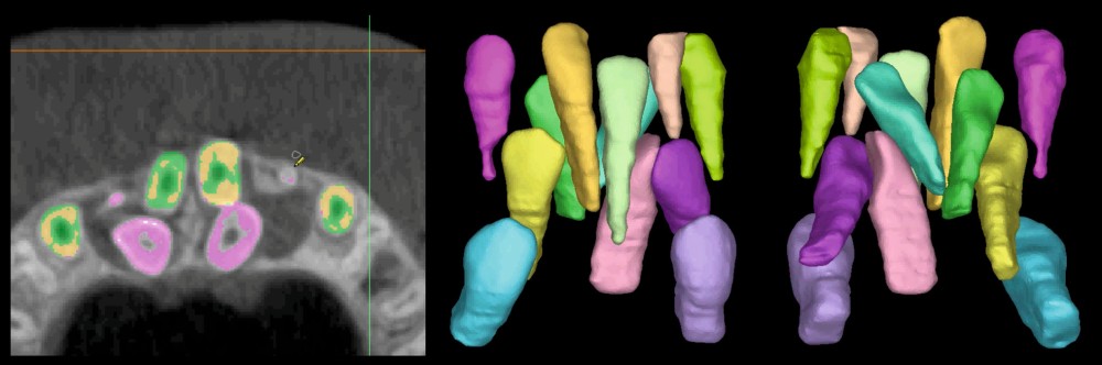 Nous avons alors recours à la segmentation de l’imagerie CBCT : cette méthode permet de « colorier » les éléments d’intérêt sur les différentes coupes de l’imagerie, pour reconstruire finement la situation tridimensionnelle (fig. 2). Les 3 incisives surnuméraires sont alors facilement objectivables. L’obstacle majeur à l’utilisation de cet outil en clinique est le temps nécessaire pour effectuer cette segmentation : à l’époque, il fallait plusieurs heures de « coloriage » manuel pour un seul CBCT [1] ! Ce temps de traitement constituait un frein majeur à l’adoption de cet outil en clinique, ce qui a constitué la motivation principale de notre travail.