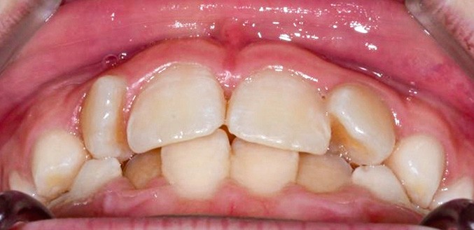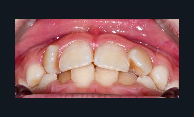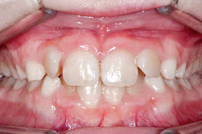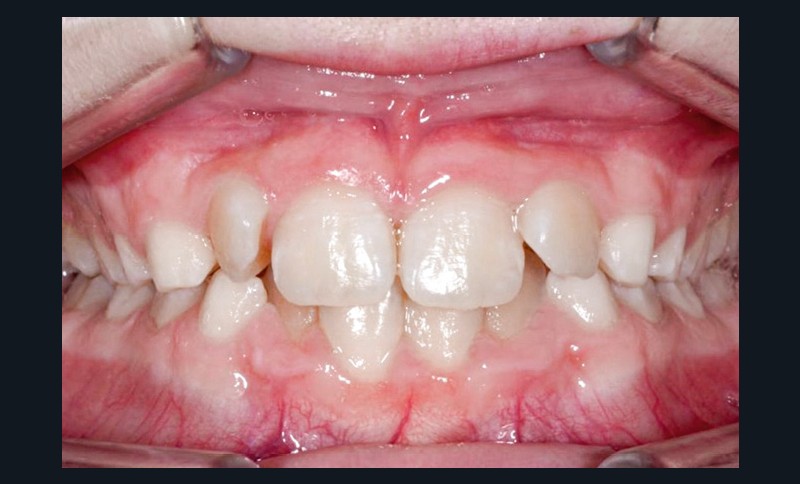 La patiente consulte à l’âge de 9 ans pour la malposition de ses incisives latérales maxillaires. Elle présente une occlusion de Classe I bilatérale sur un schéma normodivergent avec une dysharmonie dento-maxillaire en denture mixte. À l’arcade maxillaire, elle présente une endoalvéolie avec rotations mésiopalatines de 16 et 26.