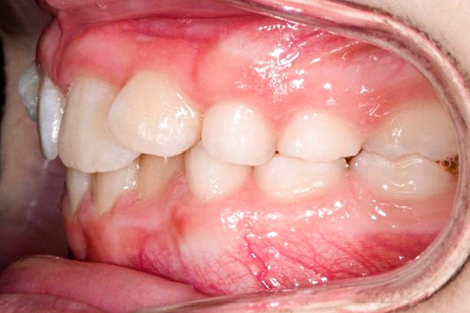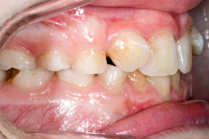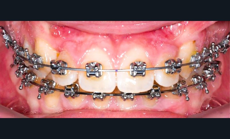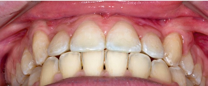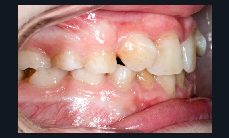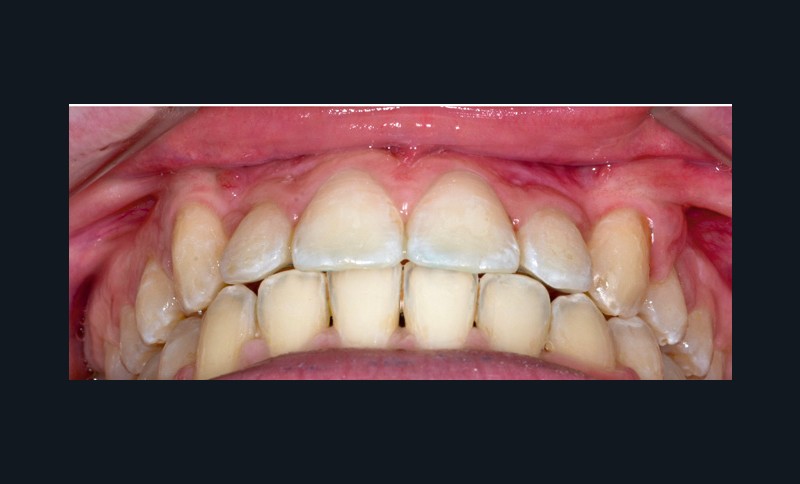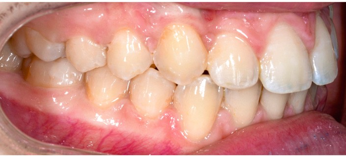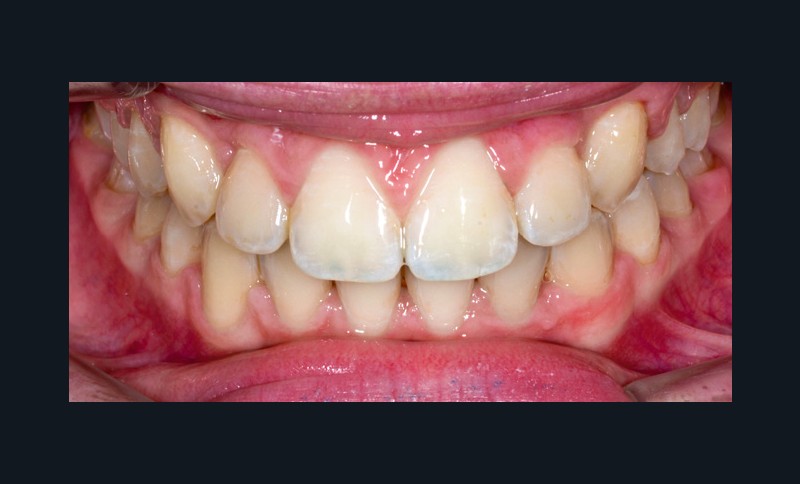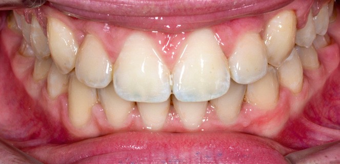 L’appareil est déposé après la mise en place de contentions collées de 12 à 22 et de 33 à 43 avec le port nocturne d’une plaque de Hawley à l’arcade maxillaire. Le temps de traitement actif a été de 41 mois.