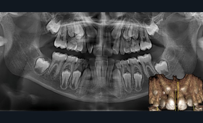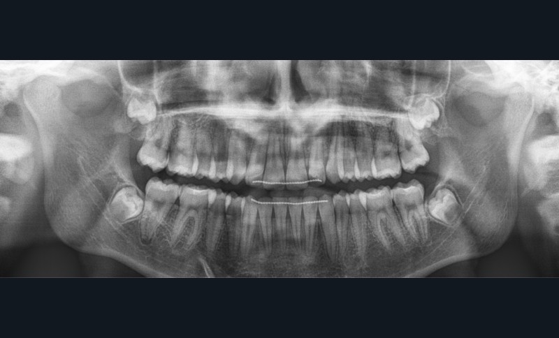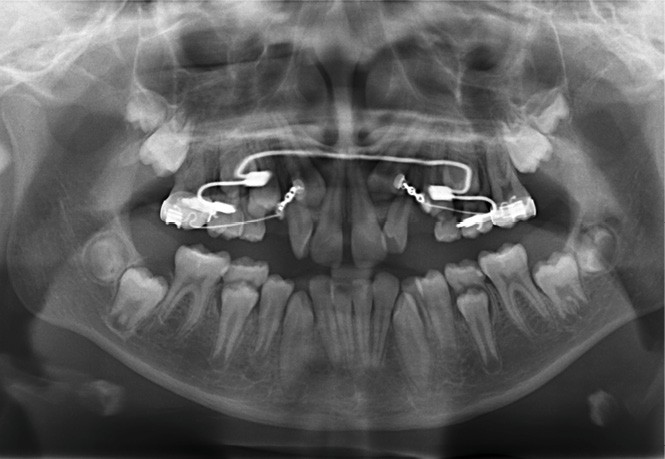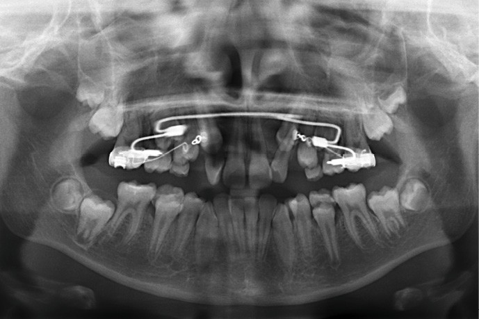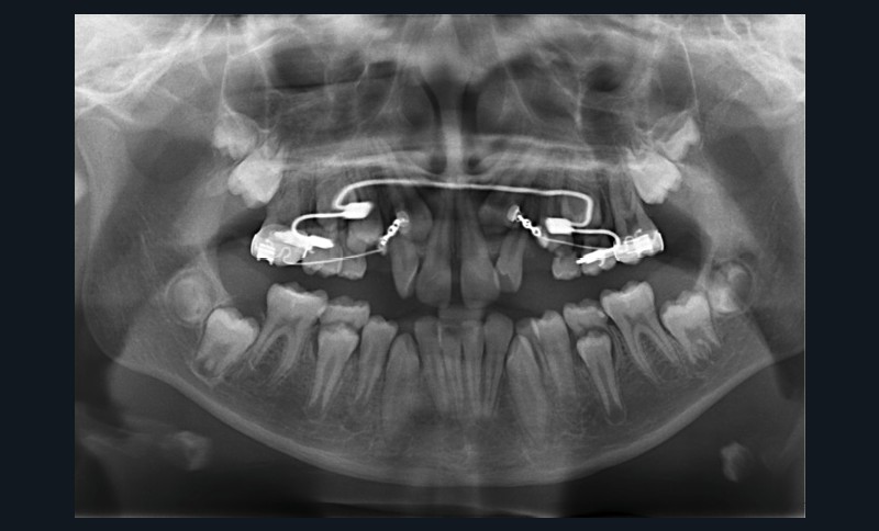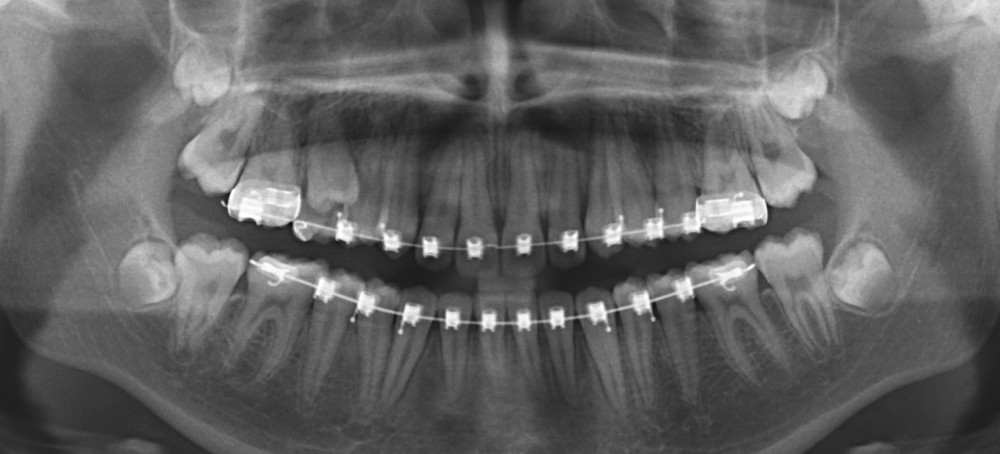 À ce stade, une radiographie panoramique est réalisée pour s’assurer de l’intégrité des racines, contrôler les axes dentaires et planifier le repositionnement de certaines attaches ainsi que le collage des tubes sur les secondes molaires en cours d’éruption.
