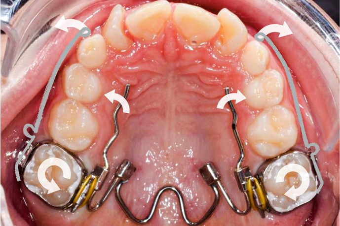Les traitements des transpositions sont souvent complexes car il y a plusieurs facteurs à prendre en compte : la morphologie dentaire, les considérations esthétiques, le stade d’édification radiculaire, la position des couronnes et des racines dans le processus alvéolaire dans les trois plans de l’espace, le temps de traitement et la motivation du patient [1]. L’utilisation d’un renfort d’ancrage transpalatin pour la correction des transpositions de canines est bien documentée dans la littérature [2], d’autant plus que chez ces jeunes patients, idéalement traités avant l’âge de 10 ans [3], la pose d’ancrages osseux en vestibulaire est contre-indiquée au vu de la présence de germes au niveau des sites d’insertions. Le choix d’un dispositif à mémoire de forme, préactivé pour délivrer des forces légères et continues (300-500 g) favorisant l’expansion transversale et la dérotation molaire simultanée sans réactivation manuelle, associé à l’utilisation de bras en TMA reliant les molaires aux canines incluses, nous a permis de profiter du moment généré par la dérotation des 16 et 26 pour emmener les canines en direction vestibulaire. Nous avons ainsi pu préserver les racines des incisives maxillaires lors de la correction des transpositions, de manière simple, contrôlée et confortable pour la patiente, tout en facilitant la phase de multi-attache qui a suivi.