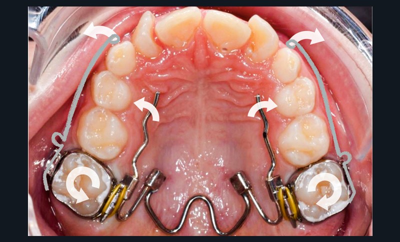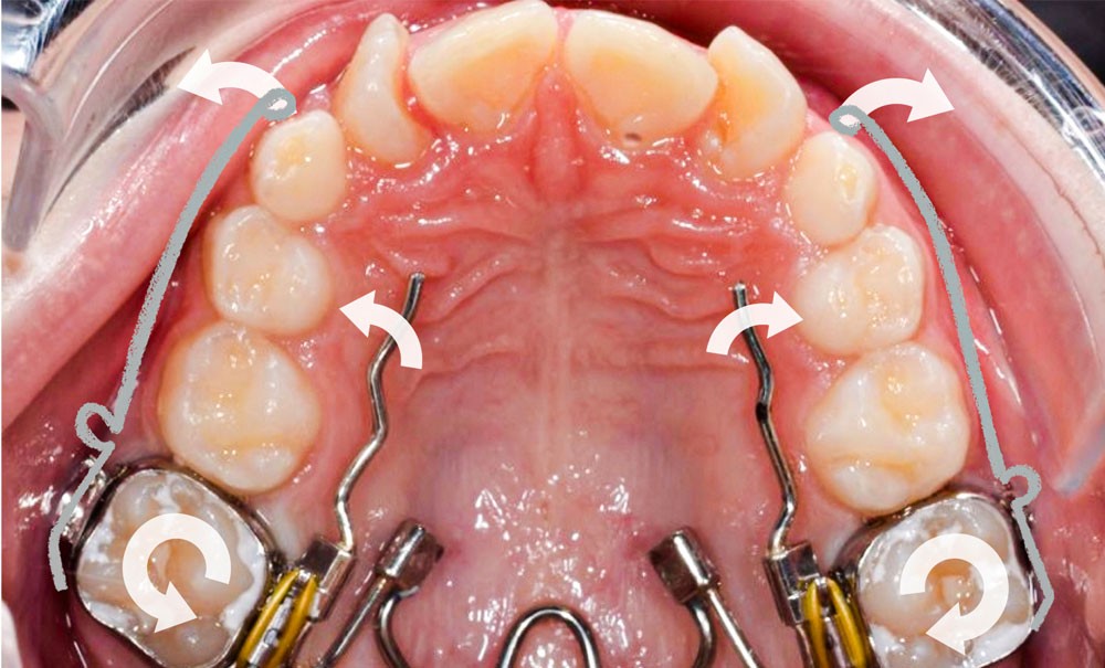Trois jours plus tard, des bras en TMA .017 x .025 habillés d’une gaine de protection avec omega au contact des tubes des premières molaires et dont l’extrémité mésiale forme une boucle sont ligaturés aux dispositifs collés de traction.