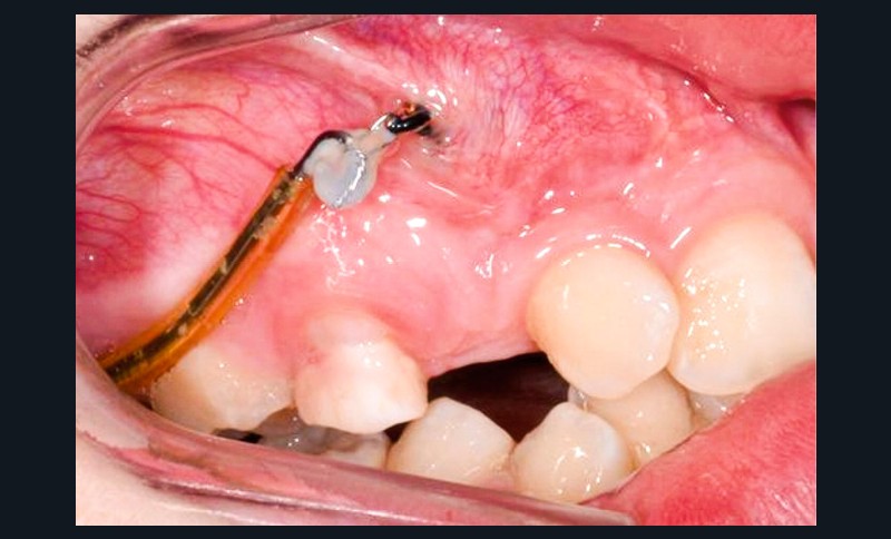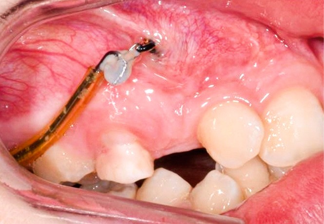 Sept jours après la pose du dispositif, une intervention chirurgicale est réalisée sous anesthésie locale lors de laquelle a lieu le collage de dispositifs de traction sur 13 et 23. Les canines temporaires sont extraites dans le même temps opératoire.