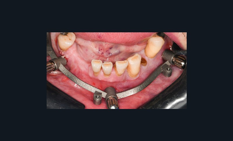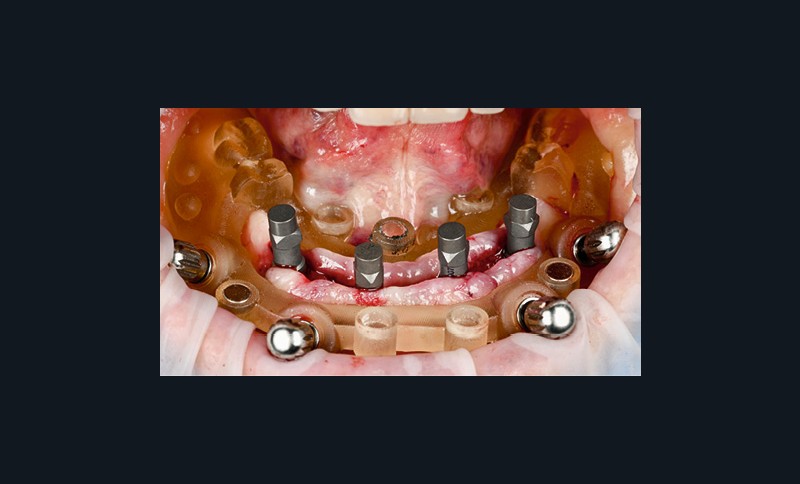 - appui dentaire : il est le plus fiable car son positionnement est permis grâce à des points fixes (fig. 4). Il reste bien sûr dépendant de la précision de l’alignement entre le STL de l’empreinte optique et le DICOM de l’examen CBCT ;