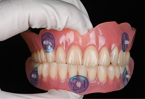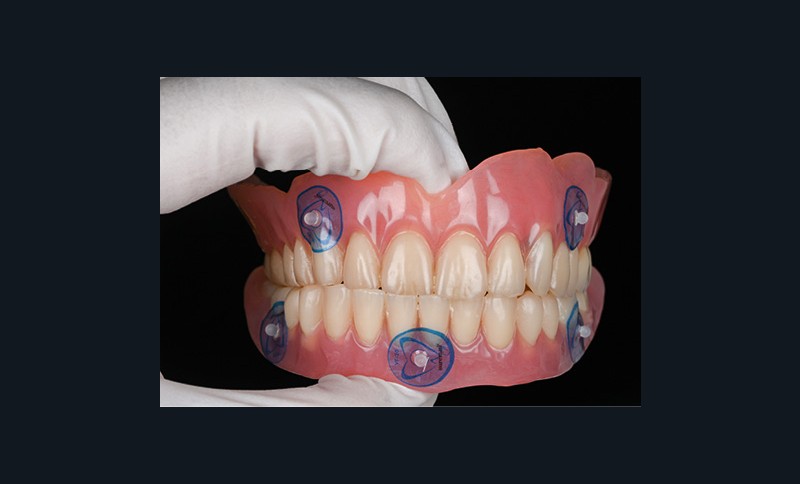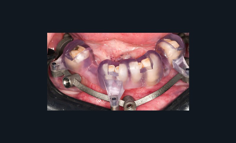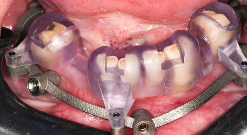 - appui muqueux : sa précision est inférieure. Réservé aux cas d’édentement total, il est conçu à partir d’un alignement avec une prothèse amovible complète comportant des marqueurs radio-opaques (fig. 5 à 8). Le risque d’imprécision est majoré par la dépressibilité de la muqueuse, la tuméfaction des tissus mous due à l’anesthésie, ou le positionnement initial en s’aidant de l’occlusion ;