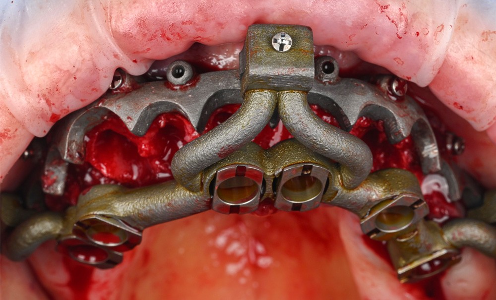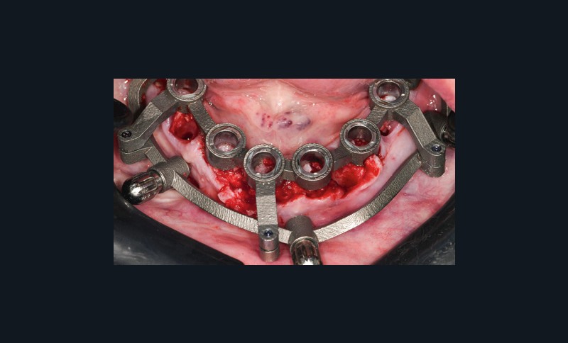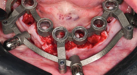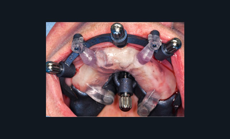 Un premier étage, appelé guide base, est fixé sur le maxillaire à implanter et servira de socle pour les étages supérieurs à empiler (fig. 2). Il doit être aussi rigide que stable pour supporter les contraintes pendant toute la durée de l’intervention : celles du forage implantaire comme celles des poses et déposes des étages supérieurs. Son bon positionnement est donc crucial car il déterminera celui des autres étages. Il peut également servir de repère en fin de procédure, tel un guide de scannage, pour réaliser une empreinte optique (fig. 3). Les appuis sont aussi divers qu’avec un guide statique conventionnel :