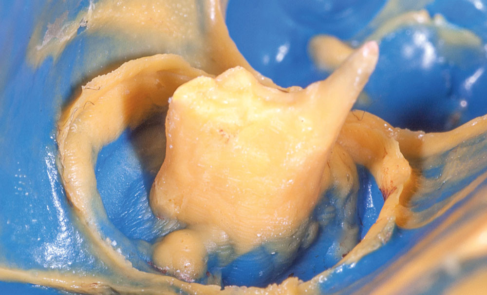 Jusqu’à une période encore récente, les solutions thérapeutiques adoptées lors de pertes de substance majeures faisaient appel à la mise en place d’une reconstitution corono-radiculaire directe (matériaux insérés en phase plastique, avec ou sans tenon radiculaire) ou indirecte (restauration métallique de type inlay-core) associée à une couronne périphérique [3]. Ces procédés ont été critiqués pour leur côté invasif augmentant encore la fragilité initiale de la dent, et susceptibles d’être à l’origine de fractures radiculaires et de difficultés de réintervention.