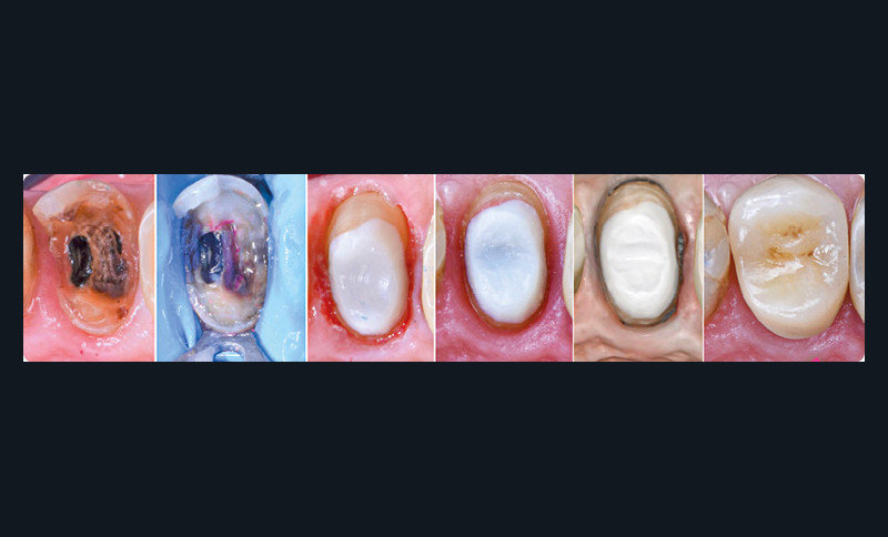 Le cas clinique présenté illustre l’intérêt de ces préparations verticales pour conserver la vitalité pulpaire et récupérer de la « ferrule » cervicale sur une dent pour laquelle une restauration adhésive n’est pas indiquée. Trois rendez‑vous auront été nécessaires. L’une des clefs du succès réside assurément dans la temporisation suffisamment longue entre la préparation et l’empreinte (pour permettre la maturation gingivale).