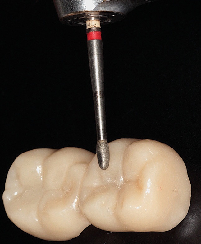 Lorsque les prothèses sont en zircone, ces retouches peuvent présenter certaines conséquences et doivent utiliser une instrumentation adaptée. En effet, la retouche va modifier la structure polie de la surface réalisée par le laboratoire de prothèse. Le passage de fraises pour adapter l’occlusion initie une augmentation importante de la rugosité de surface de la zircone. Si elle n’est pas polie parfaitement, ce dépolissage de la surface de la zircone aura notamment deux conséquences : augmentation de l’usure de la dent antagoniste et initiation d’une zone de fragilisation de la coiffe en zircone. Pour une retouche peu importante, le praticien peut utiliser successivement les fraises ZR850 et ZR379L pour approcher l’occlusion. Une fois les contacts presque obtenus (des points d’occlusion apparaissent sur les dents naturelles adjacentes à la prothèse fixée mais moins dense en couleur), le réglage est affiné avec les fraises bagues rouge et blanche (ZR8850 et ZR 8379L à une vitesse de rotation de 160 000 tours/minutes sous spray). L’occlusion obtenue, le polissage mécanique de surface est fini avec les polissoires (à une vitesse de rotation de 6 000 tours/minutes sous spray) du coffret Komet 4637 (fig. 2). Le temps de polissage est très important pour l’obtention d’un poli miroir [6].
