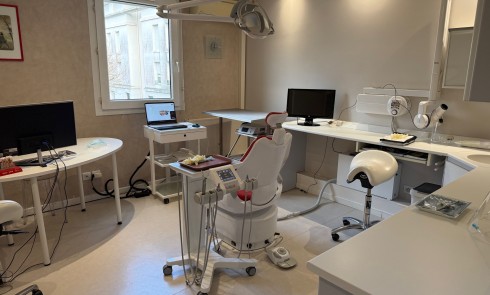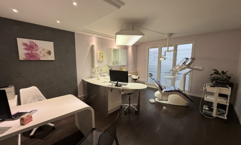 2 fauteuils de soins (dont 1 ambidextre), salle de stérilisation, salle d’attente