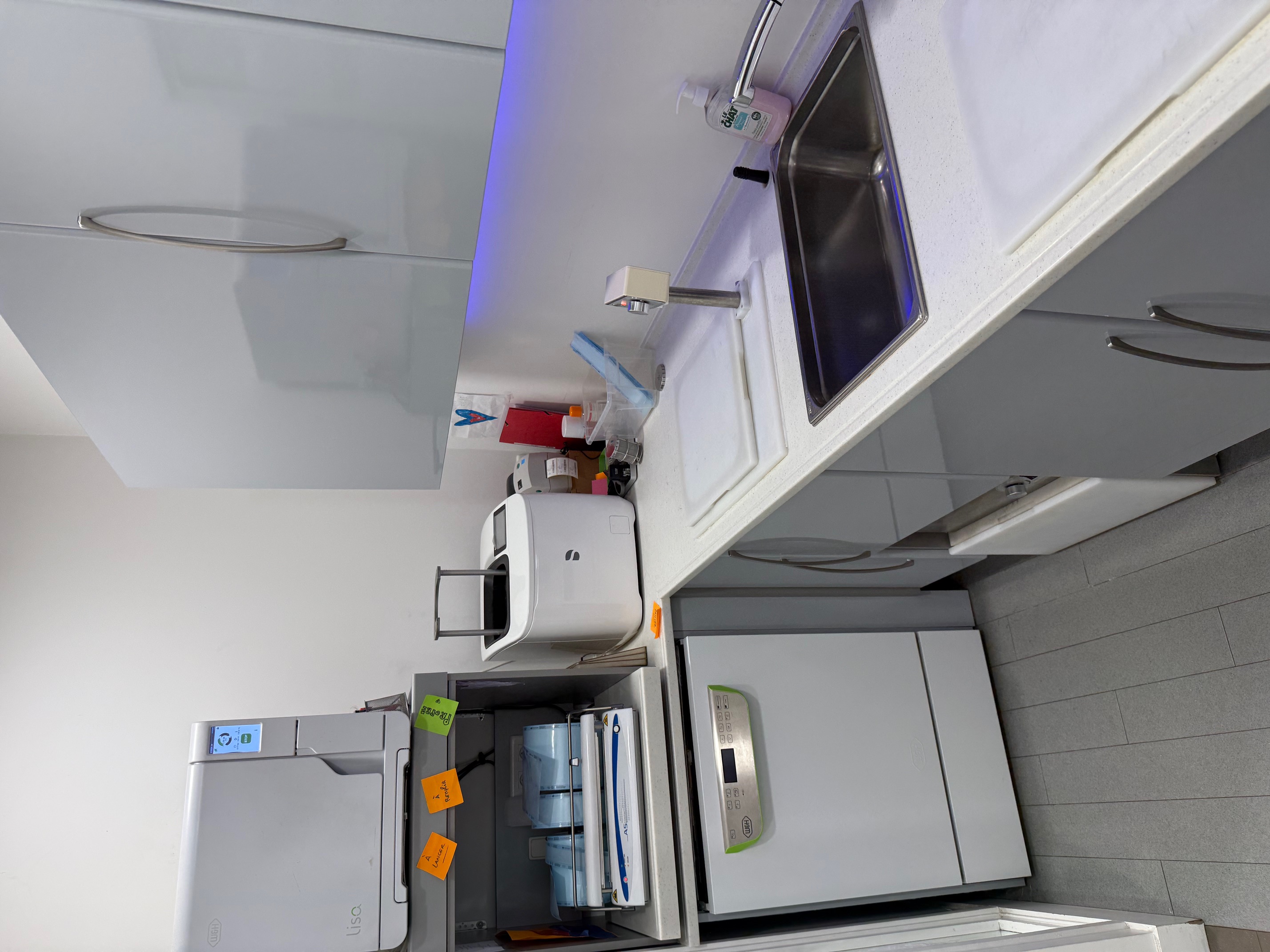 Salle de stérilisation complète : chaîne Gamasonic, DAC W&H, Thermo-désinfecteur Miele, autoclave W&H Lisa