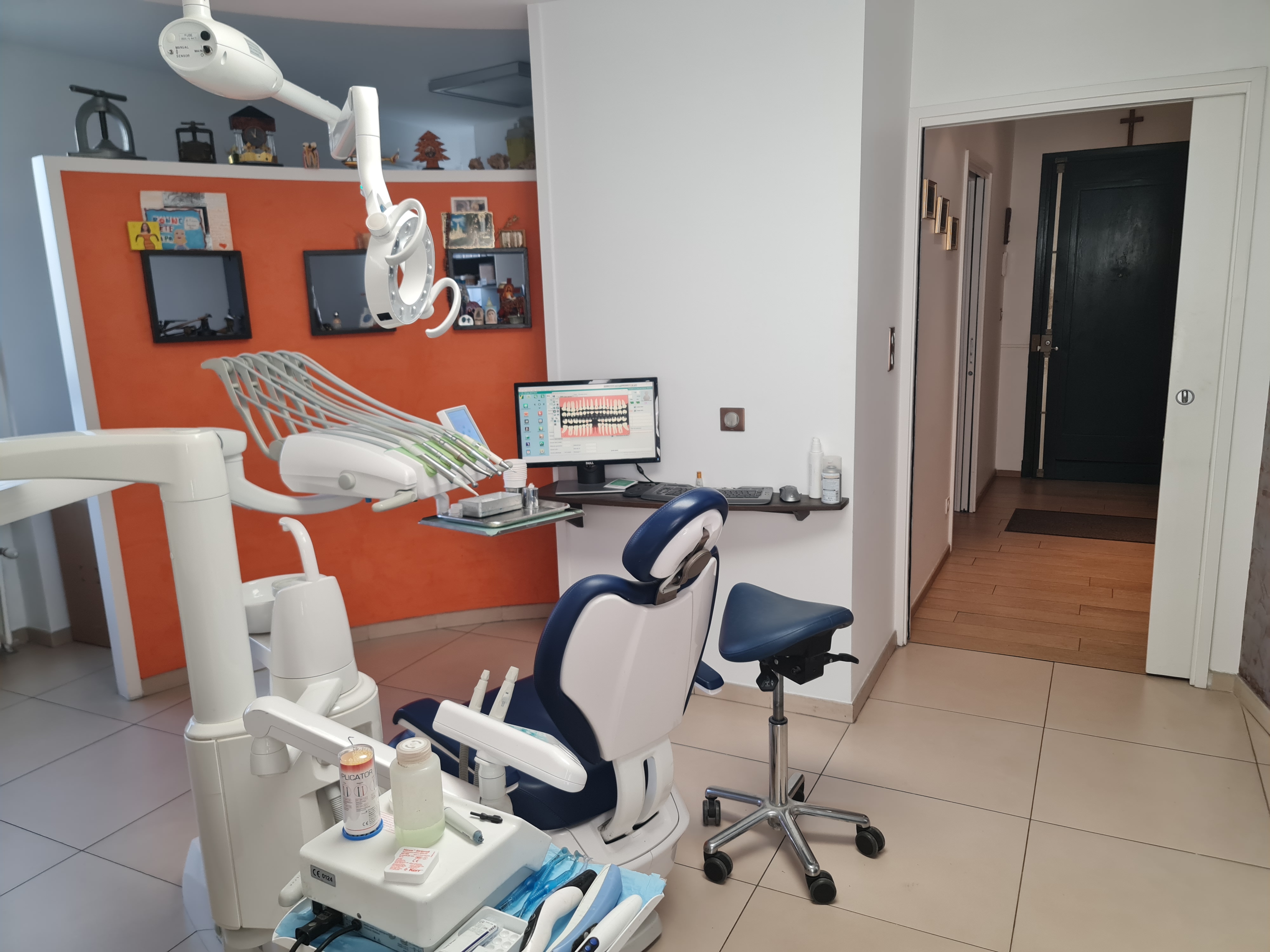 salle de soins avec un fauteuil , salle avec chaine de stérilisation gamasonic autoclave, salle d attente ,local technique et un coin bureautique avec deux ecrans logiciel professionel julie et capteur RVG